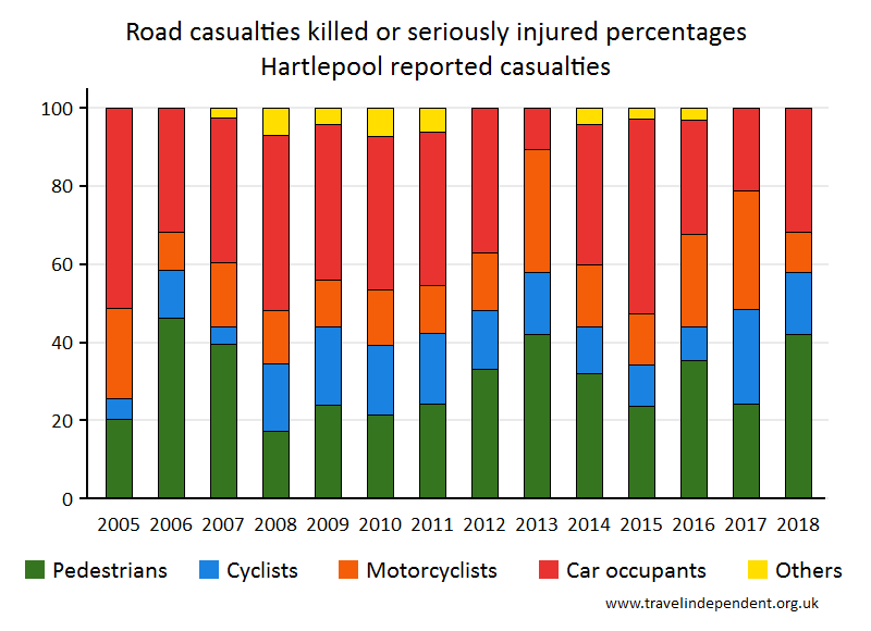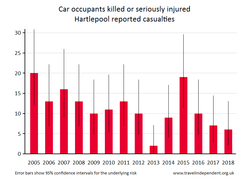 Hartlepool Reported Road CasualtiesThis web page shows data only up to 2018. For tables and charts that include 2019 data for each police area and each local authority, go to pedestriansafety.org.uk/stats.php This is a report on the Department for Transport (DfT STATS19) records of road casualties in the Hartlepool Highway Authority area. See Notes for information on highway authorities. The sections are 1. Number of children killed or seriously injured 2. Numbers (all ages) killed or seriously injured 3. Numbers (all ages) killed 4. Notes and sources 1. Number of children killed or seriously injuredThe pie chart shows the breakdown by method of travel for children reported as killed or seriously injured (KSI) during 2014 - 2018. The bar chart shows KSI numbers for child pedestrians yearly since 2005. The 'error bars' show the 95% confidence intervals - read more on confidence intervals hereread more on confidence intervals at www.travelindependent.org.uk/confidence_intervals.html including why they are needed when interpreting charts.'Children' refers to the age range of 0 - 15 years.