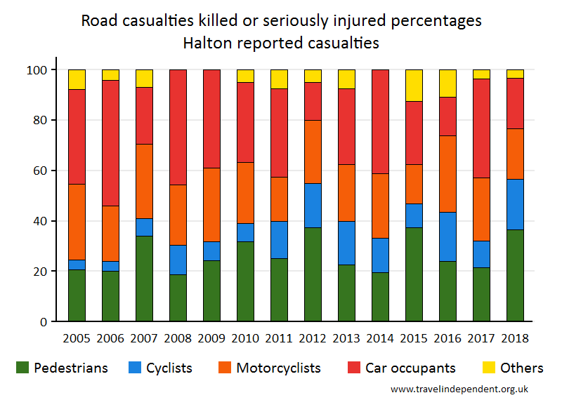 Halton Reported Road CasualtiesThis web page shows data only up to 2018. For tables and charts that include 2019 data for each police area and each local authority, go to pedestriansafety.org.uk/stats.php This is a report on the Department for Transport (DfT STATS19) records of road casualties in the Halton Highway Authority area. See Notes for information on highway authorities. The sections are 1. Number of children killed or seriously injured 2. Numbers (all ages) killed or seriously injured 3. Numbers (all ages) killed 4. Notes and sources 1. Number of children killed or seriously injuredThe pie chart shows the breakdown by method of travel for children reported as killed or seriously injured (KSI) during 2014 - 2018. The bar chart shows KSI numbers for child pedestrians yearly since 2005. The 'error bars' show the 95% confidence intervals - read more on confidence intervals hereread more on confidence intervals at www.travelindependent.org.uk/confidence_intervals.html including why they are needed when interpreting charts.'Children' refers to the age range of 0 - 15 years.
