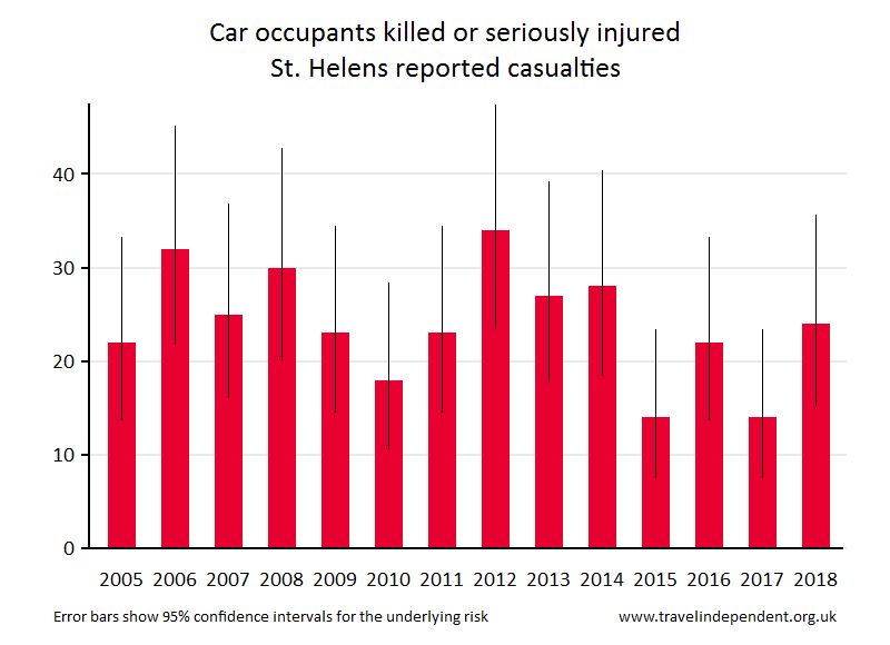 St. Helens Reported Road CasualtiesThis web page shows data only up to 2018. For tables and charts that include 2019 data for each police area and each local authority, go to pedestriansafety.org.uk/stats.php This is a report on the Department for Transport (DfT STATS19) records of road casualties in the St. Helens Highway Authority area. See Notes for information on highway authorities. The sections are 1. Number of children killed or seriously injured 2. Numbers (all ages) killed or seriously injured 3. Numbers (all ages) killed 4. Notes and sources 1. Number of children killed or seriously injuredThe pie chart shows the breakdown by method of travel for children reported as killed or seriously injured (KSI) during 2014 - 2018. The bar chart shows KSI numbers for child pedestrians yearly since 2005. The 'error bars' show the 95% confidence intervals - read more on confidence intervals hereread more on confidence intervals at www.travelindependent.org.uk/confidence_intervals.html including why they are needed when interpreting charts.'Children' refers to the age range of 0 - 15 years.