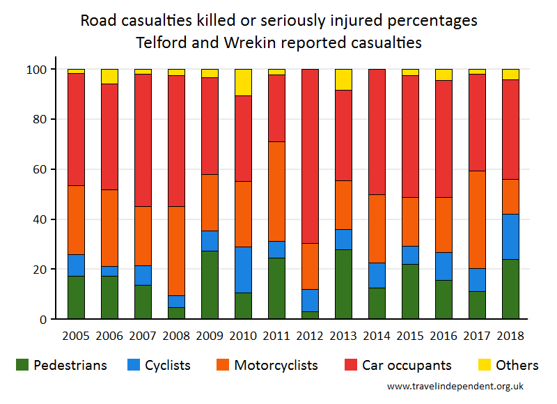 Telford and Wrekin Reported Road CasualtiesThis web page shows data only up to 2018. For tables and charts that include 2019 data for each police area and each local authority, go to pedestriansafety.org.uk/stats.php This is a report on the Department for Transport (DfT STATS19) records of road casualties in the Telford and Wrekin Highway Authority area. See Notes for information on highway authorities. The sections are 1. Number of children killed or seriously injured 2. Numbers (all ages) killed or seriously injured 3. Numbers (all ages) killed 4. Notes and sources 1. Number of children killed or seriously injuredThe pie chart shows the breakdown by method of travel for children reported as killed or seriously injured (KSI) during 2014 - 2018. The bar chart shows KSI numbers for child pedestrians yearly since 2005. The 'error bars' show the 95% confidence intervals - read more on confidence intervals hereread more on confidence intervals at www.travelindependent.org.uk/confidence_intervals.html including why they are needed when interpreting charts.'Children' refers to the age range of 0 - 15 years.