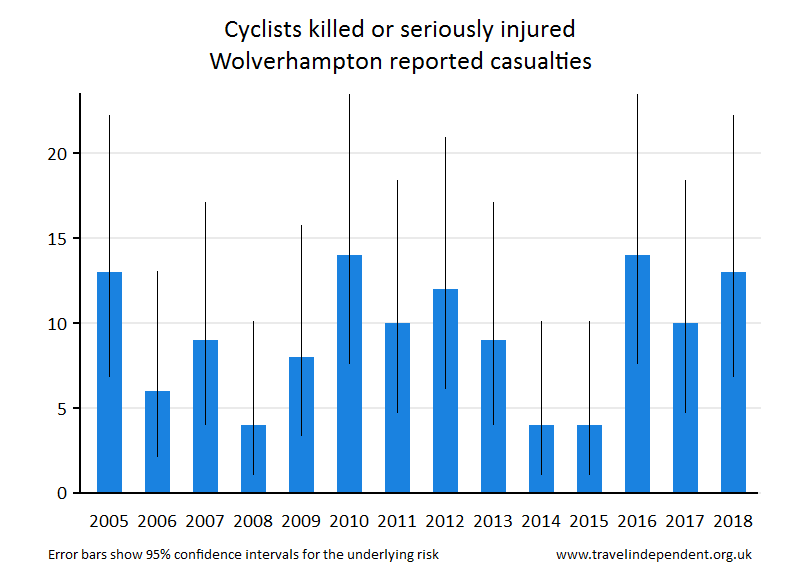 Wolverhampton Reported Road CasualtiesThis web page shows data only up to 2018. For tables and charts that include 2019 data for each police area and each local authority, go to pedestriansafety.org.uk/stats.php This is a report on the Department for Transport (DfT STATS19) records of road casualties in the Wolverhampton Highway Authority area. See Notes for information on highway authorities. The sections are 1. Number of children killed or seriously injured 2. Numbers (all ages) killed or seriously injured 3. Numbers (all ages) killed 4. Notes and sources 1. Number of children killed or seriously injuredThe pie chart shows the breakdown by method of travel for children reported as killed or seriously injured (KSI) during 2014 - 2018. The bar chart shows KSI numbers for child pedestrians yearly since 2005. The 'error bars' show the 95% confidence intervals - read more on confidence intervals hereread more on confidence intervals at www.travelindependent.org.uk/confidence_intervals.html including why they are needed when interpreting charts.'Children' refers to the age range of 0 - 15 years.