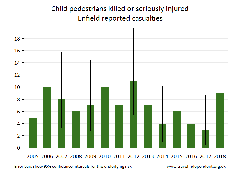 Enfield Reported Road CasualtiesThis web page shows data only up to 2018. For tables and charts that include 2019 data for each police area and each local authority, go to pedestriansafety.org.uk/stats.php This is a report on the Department for Transport (DfT STATS19) records of road casualties in the Enfield Highway Authority area. See Notes for information on highway authorities. The sections are 1. Number of children killed or seriously injured 2. Numbers (all ages) killed or seriously injured 3. Numbers (all ages) killed 4. Notes and sources 1. Number of children killed or seriously injuredThe pie chart shows the breakdown by method of travel for children reported as killed or seriously injured (KSI) during 2014 - 2018. The bar chart shows KSI numbers for child pedestrians yearly since 2005. The 'error bars' show the 95% confidence intervals - read more on confidence intervals hereread more on confidence intervals at www.travelindependent.org.uk/confidence_intervals.html including why they are needed when interpreting charts.'Children' refers to the age range of 0 - 15 years.