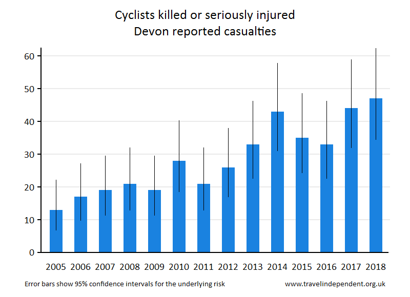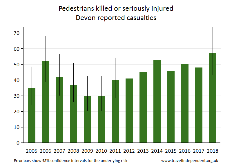 Devon Reported Road CasualtiesThis web page shows data only up to 2018. For tables and charts that include 2019 data for each police area and each local authority, go to pedestriansafety.org.uk/stats.php This is a report on the Department for Transport (DfT STATS19) records of road casualties in the Devon Highway Authority area. See Notes for information on highway authorities. The sections are 1. Number of children killed or seriously injured 2. Numbers (all ages) killed or seriously injured 3. Numbers (all ages) killed 4. Notes and sources 1. Number of children killed or seriously injuredThe pie chart shows the breakdown by method of travel for children reported as killed or seriously injured (KSI) during 2014 - 2018. The bar chart shows KSI numbers for child pedestrians yearly since 2005. The 'error bars' show the 95% confidence intervals - read more on confidence intervals hereread more on confidence intervals at www.travelindependent.org.uk/confidence_intervals.html including why they are needed when interpreting charts.'Children' refers to the age range of 0 - 15 years.