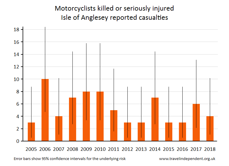 Isle of Anglesey Reported Road CasualtiesThis web page shows data only up to 2018. For tables and charts that include 2019 data for each police area and each local authority, go to pedestriansafety.org.uk/stats.php This is a report on the Department for Transport (DfT STATS19) records of road casualties in the Isle of Anglesey Highway Authority area. See Notes for information on highway authorities. The sections are 1. Number of children killed or seriously injured 2. Numbers (all ages) killed or seriously injured 3. Numbers (all ages) killed 4. Notes and sources 1. Number of children killed or seriously injuredThe pie chart shows the breakdown by method of travel for children reported as killed or seriously injured (KSI) during 2014 - 2018. The bar chart shows KSI numbers for child pedestrians yearly since 2005. The 'error bars' show the 95% confidence intervals - read more on confidence intervals hereread more on confidence intervals at www.travelindependent.org.uk/confidence_intervals.html including why they are needed when interpreting charts.'Children' refers to the age range of 0 - 15 years.