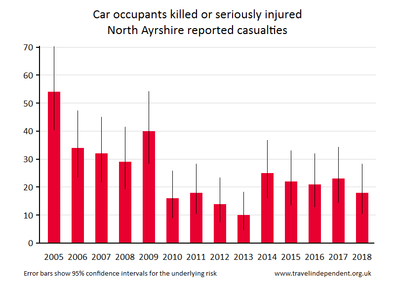North Ayrshire Reported Road CasualtiesThis web page shows data only up to 2018. For tables and charts that include 2019 data for each police area and each local authority, go to pedestriansafety.org.uk/stats.php This is a report on the Department for Transport (DfT STATS19) records of road casualties in the North Ayrshire Highway Authority area. See Notes for information on highway authorities. The sections are 1. Number of children killed or seriously injured 2. Numbers (all ages) killed or seriously injured 3. Numbers (all ages) killed 4. Notes and sources 1. Number of children killed or seriously injuredThe pie chart shows the breakdown by method of travel for children reported as killed or seriously injured (KSI) during 2014 - 2018. The bar chart shows KSI numbers for child pedestrians yearly since 2005. The 'error bars' show the 95% confidence intervals - read more on confidence intervals hereread more on confidence intervals at www.travelindependent.org.uk/confidence_intervals.html including why they are needed when interpreting charts.'Children' refers to the age range of 0 - 15 years.