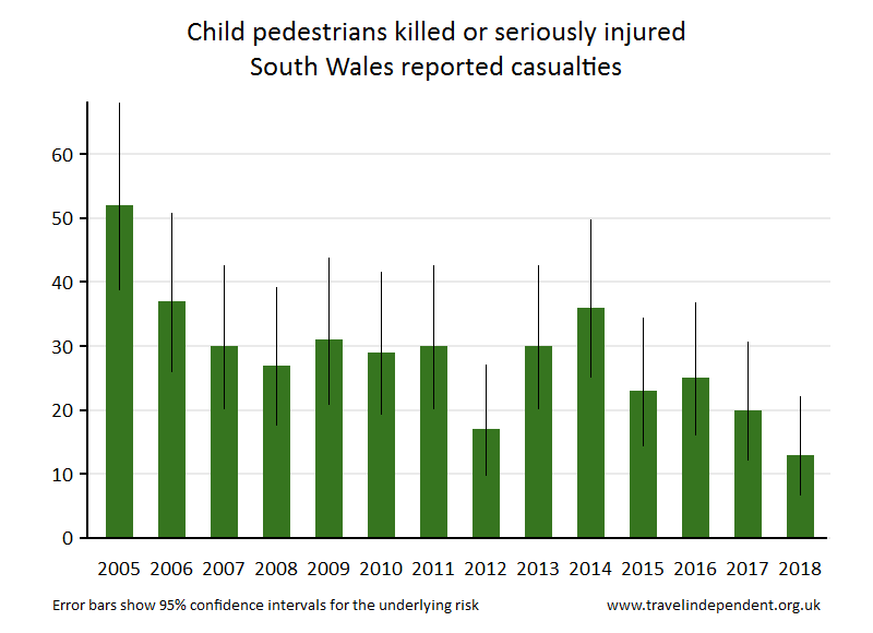 | South Wales Reported Road CasualtiesThis web page shows data only up to 2018. For tables and charts that include 2019 data for each police area and each local authority, go to pedestriansafety.org.uk/stats.php