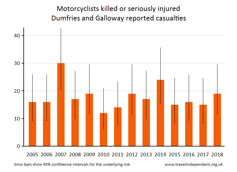 Dumfries and Galloway Reported Road CasualtiesThis web page shows data only up to 2018. For tables and charts that include 2019 data for each police area and each local authority, go to pedestriansafety.org.uk/stats.php This is a report on the Department for Transport (DfT STATS19) records of road casualties in the Dumfries and Galloway police area. The sections are 1. Number of children killed or seriously injured 2. Numbers (all ages) killed or seriously injured 3. Numbers (all ages) killed 4. Notes and sources. 1. Number of children killed or seriously injuredThe pie chart shows the breakdown by method of travel for children reported as killed or seriously injured (KSI) during 2014 - 2018. The bar chart shows KSI numbers for child pedestrians yearly since 2005. The 'error bars' show the 95% confidence intervals - read more on confidence intervals hereread more on confidence intervals at www.travelindependent.org.uk/confidence_intervals.html including why they are needed when interpreting charts.'Children' refers to the age range of 0 - 15 years.